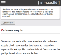 Saisissez un texte et le générateur de cadavres exquis va remplacer des mots au hasard en conservant la catégorie grammaticale et l’assonance.